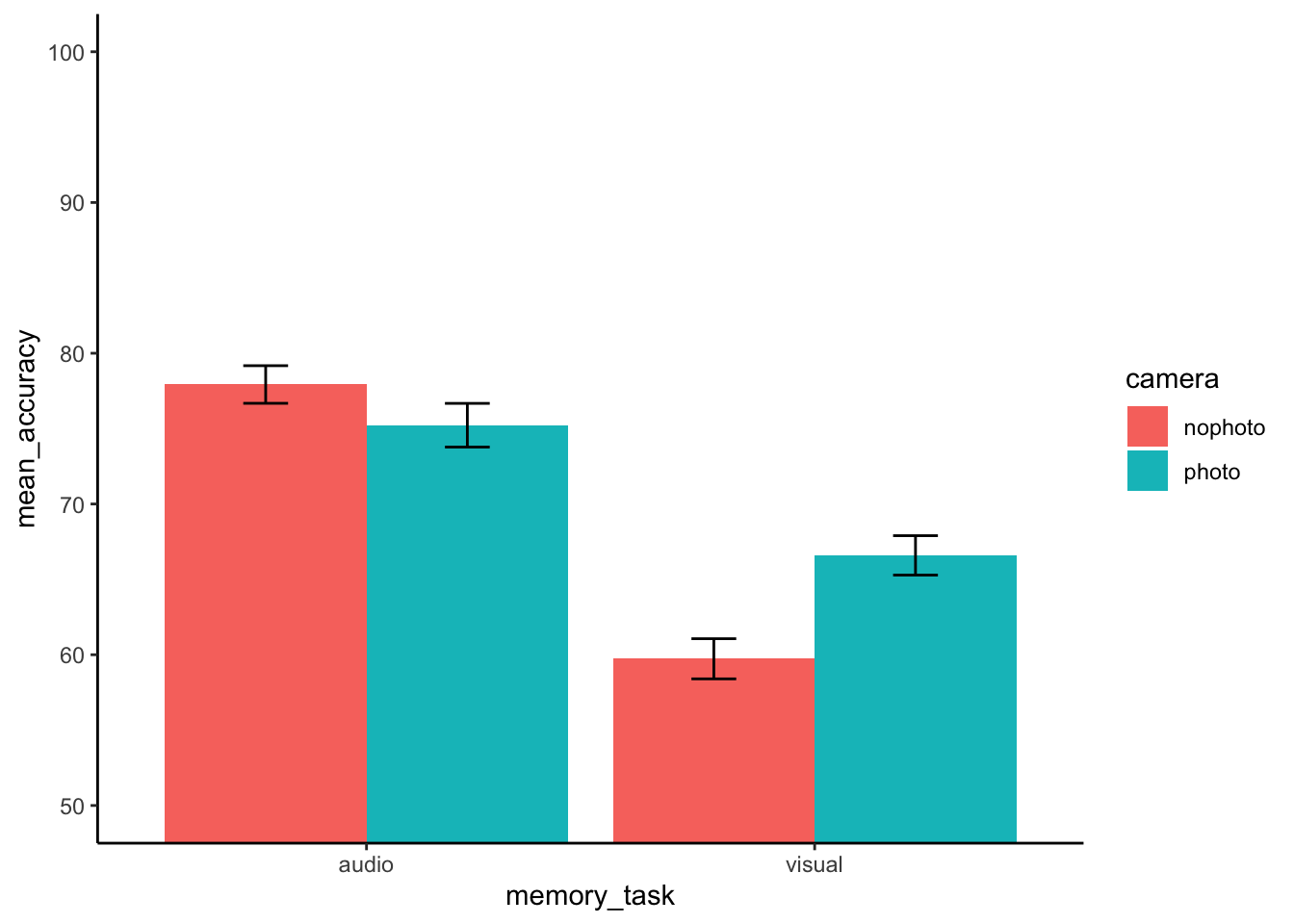 In this experiment participants visited a museum exhibit. Half the participants were able to use a camera to document their visit, while the other half were not, all while listening to an audio tour of the exhibit. At the end of the visit, everyone was given two memory tests (visual and audio) for the content they saw and heard, respectively.