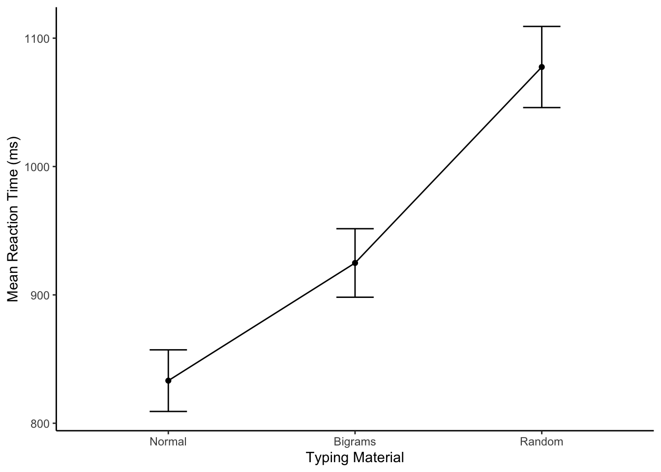 Alright, we made things a little bit more complicated than they need to be. Our primary question is whether reaction times followed this pattern: Normal < Bigrams < Random. We can see the means do follow this pattern. However, shouldn’t we only be looking at three means, why are their six means, and two lines?